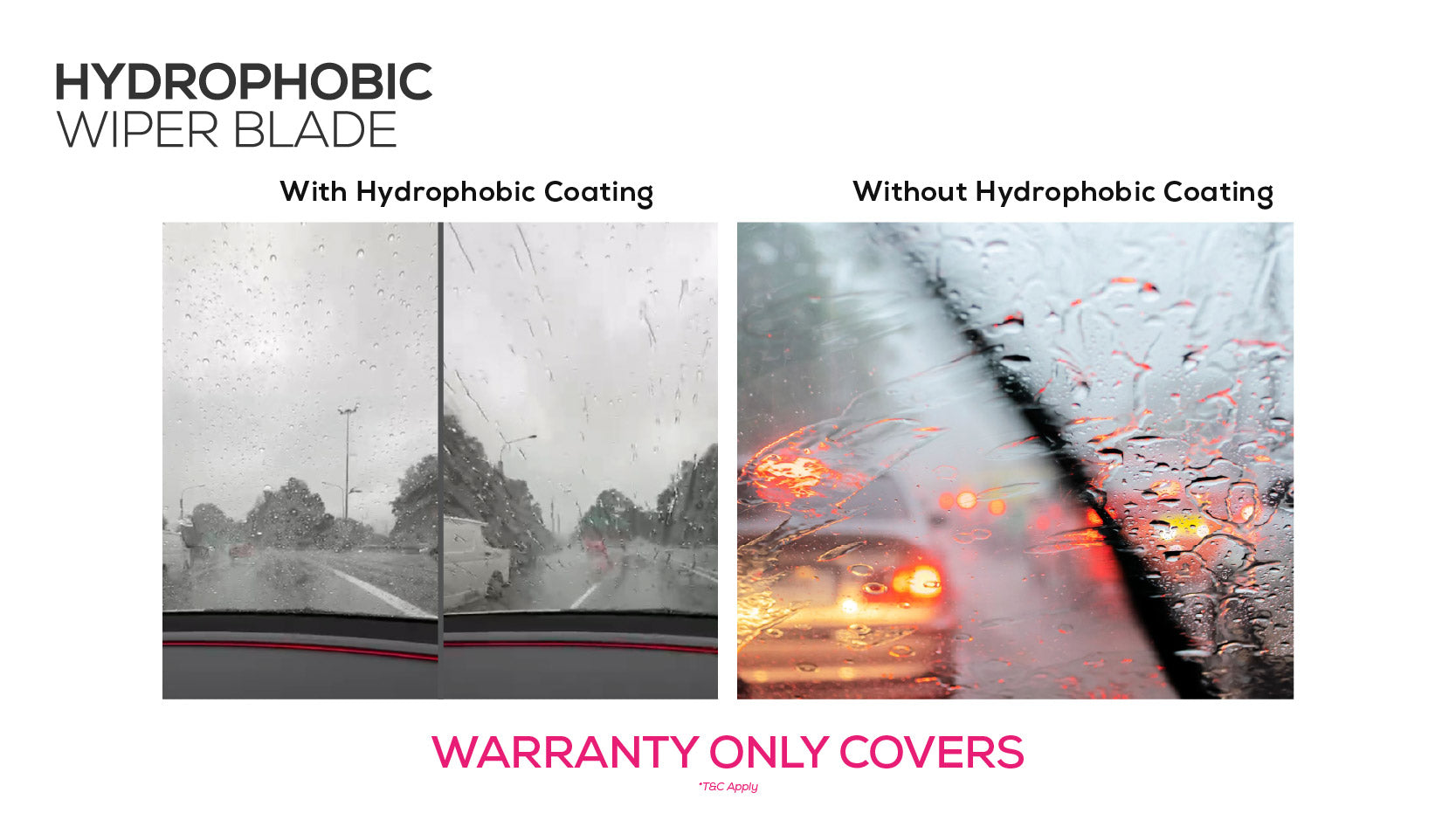 Driving with clear vision.Hydrophobic wipers are designed to create strong water-repellent coatings on your windshield with every swipe. This produce an intense water-beading efffect to prevent water build-up.Now, your vision stay clear even during heavy rain.
